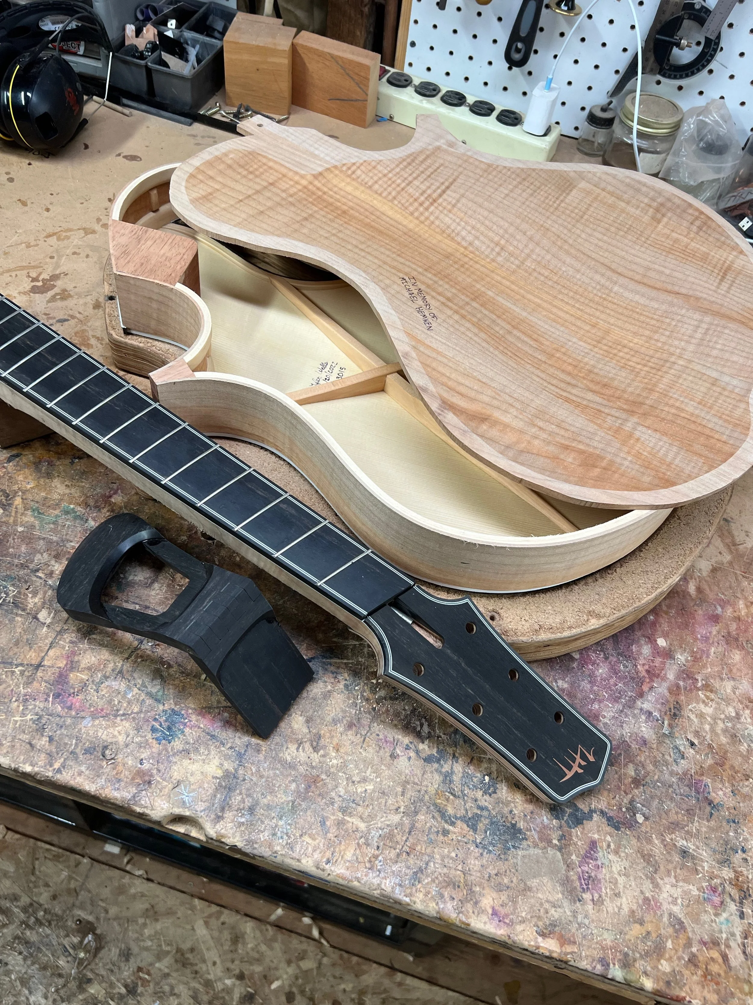 When I was finally able to get back to work, it was right about the time that everything was opening back up again, for real this time. All of the events that I had committed to from previous years that had been canceled, were now all happening that year, seemingly back to back to back. I was broke (having not worked for 3 months), behind on my orders, and stressing about how I was going to get it all done. Ignoring strong advice against the decision from my at the time shop mate, Maegen Wells, one evening I made the decision to postpone making the Hemken tribute instrument until the following year, so that I could focus on the instruments that would help with my financial situation. Literally the very next next day I received an unexpected text from Michael’s widow, Revalee, and after a quick exchange, we realized that it was a mixup (wrong Tyler) and I also discovered that it was the one year anniversary of Michael’s passing. I was working at the Ribbecke shop that day, but upon receiving that information, I immediately stopped what I was doing, drove to my storage unit to select materials, and began work on the instrument that day. I felt like the universe had sent me a definite message and I needed to listen.
