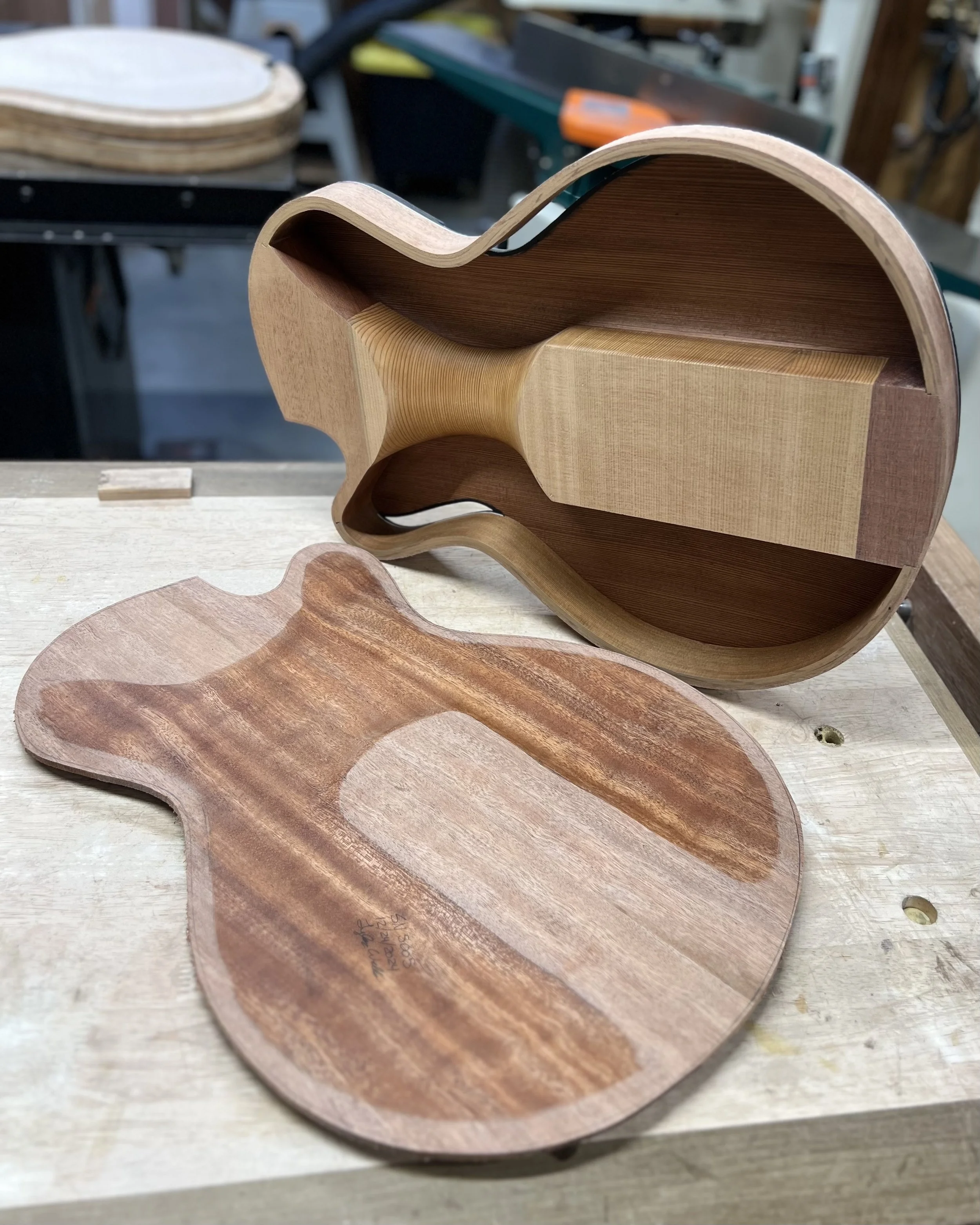 This variation is more of a semi hollow with a “Tone Tunnel.” the Photo on the left shows the construction of the interior and the Slideshow on the right gives you a look around the instrument.