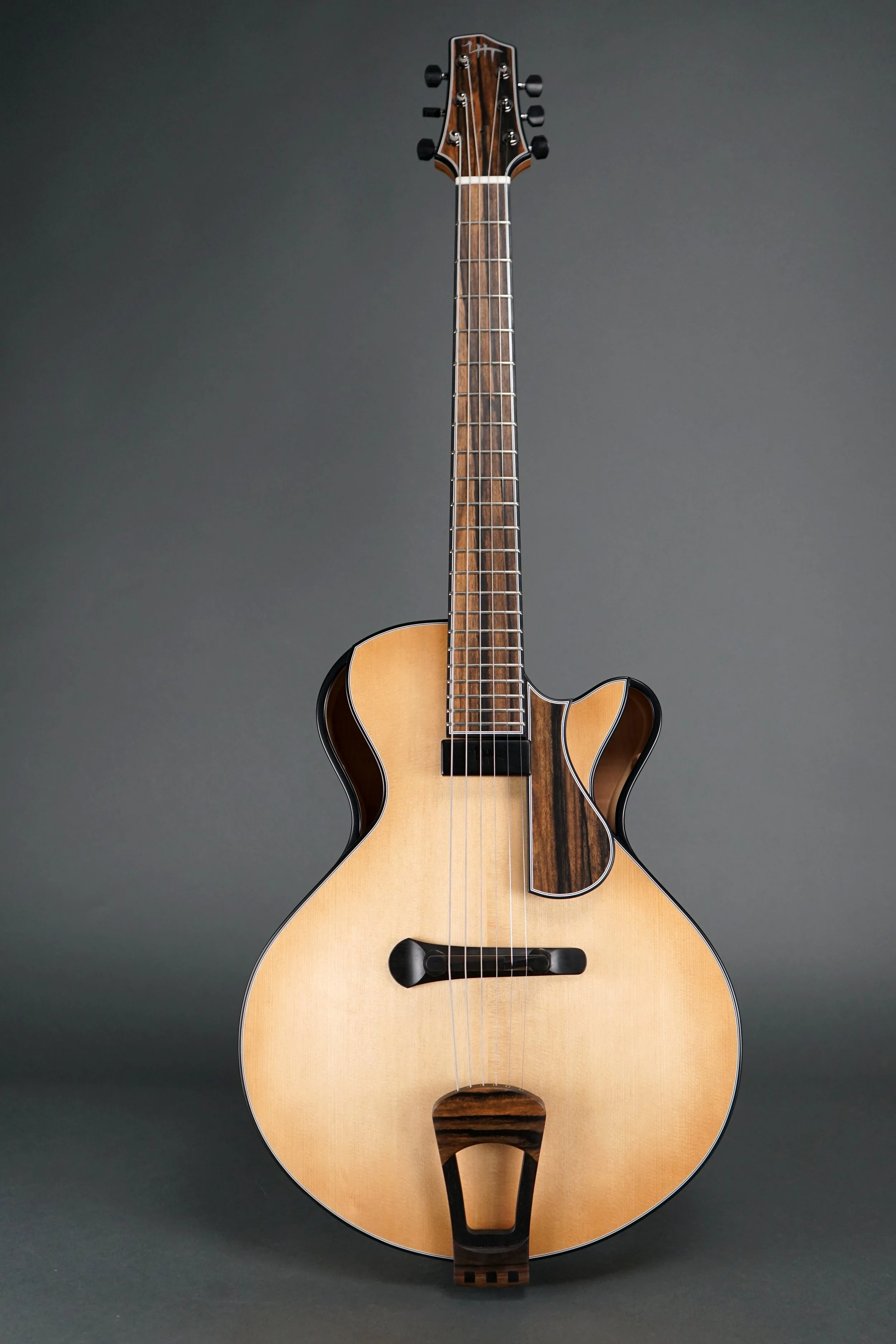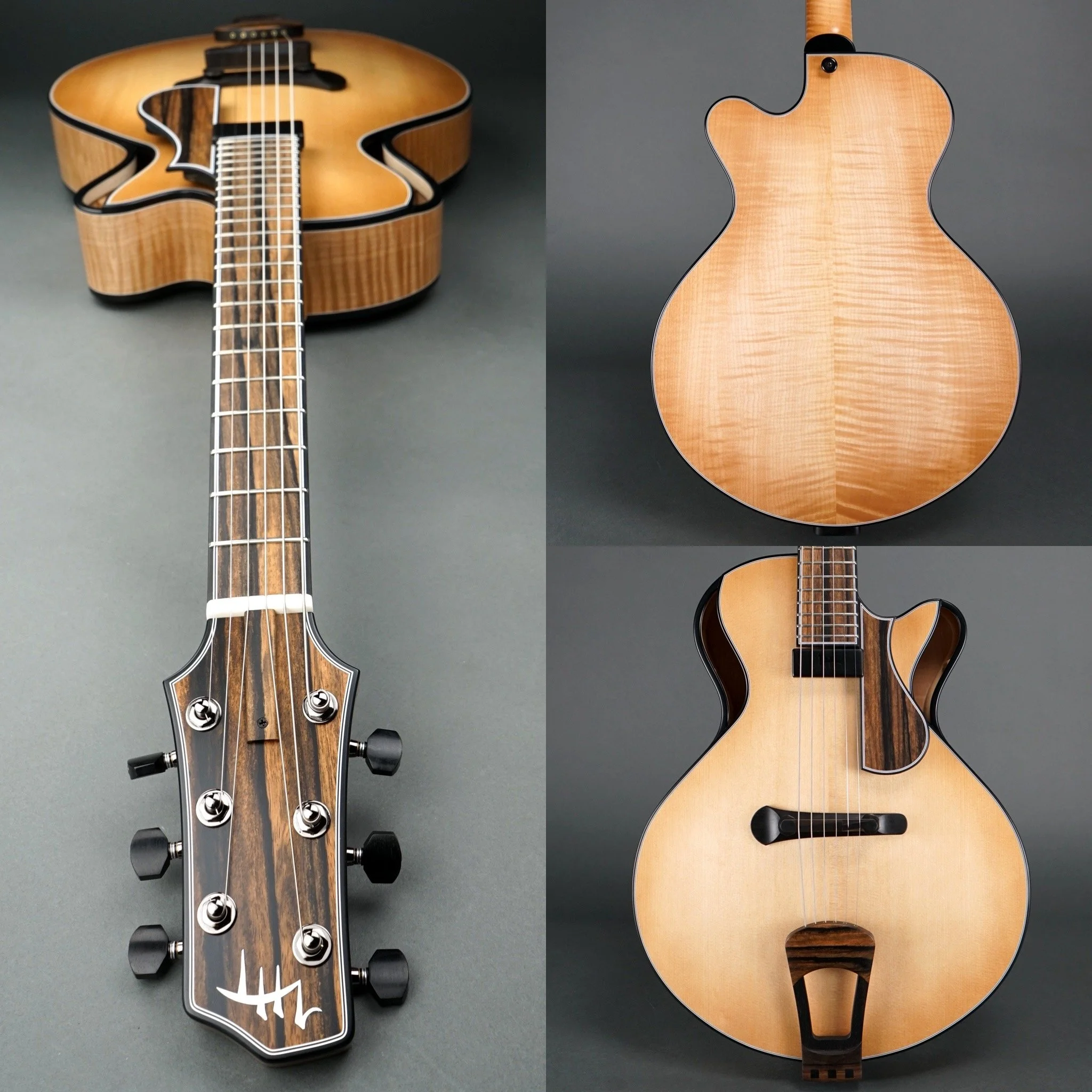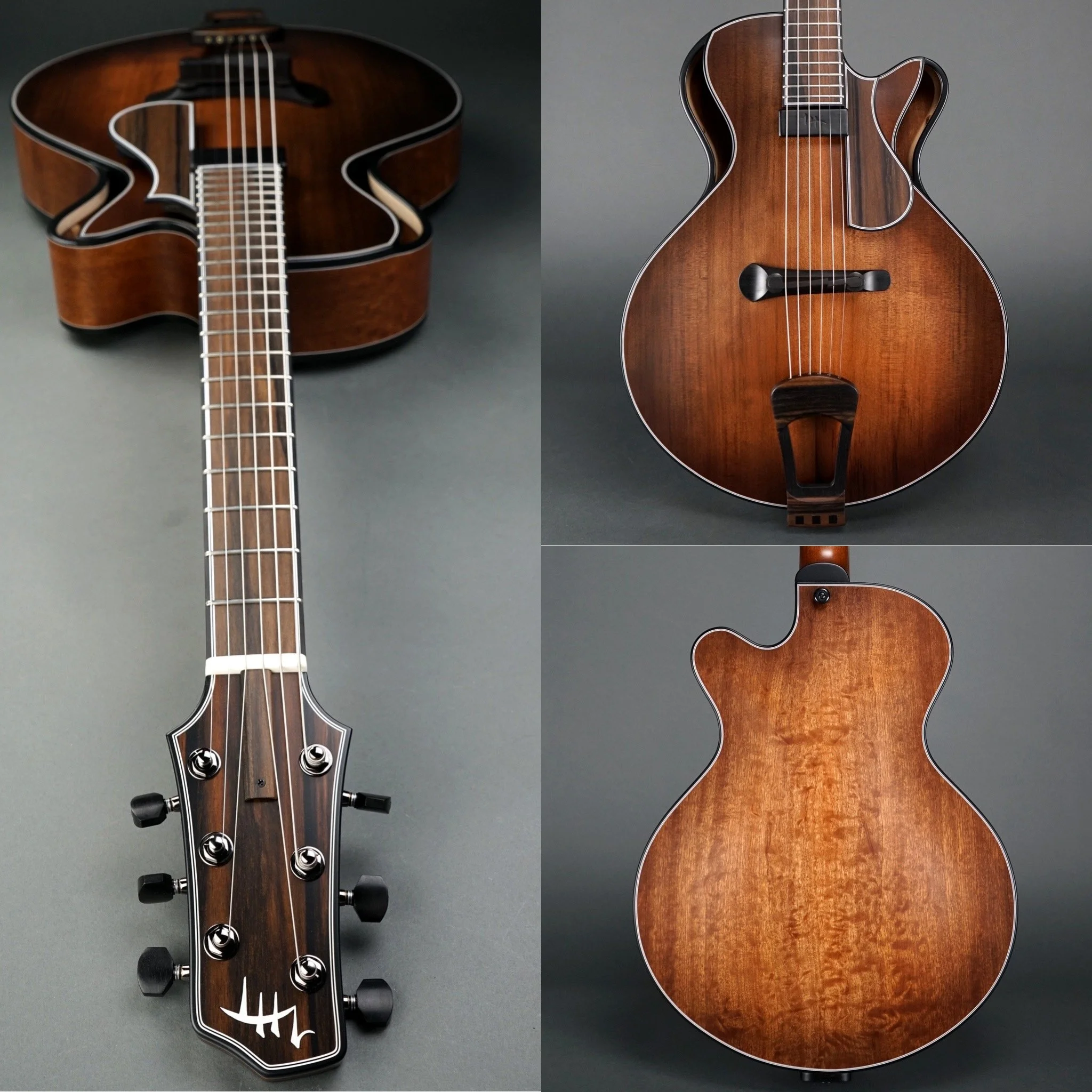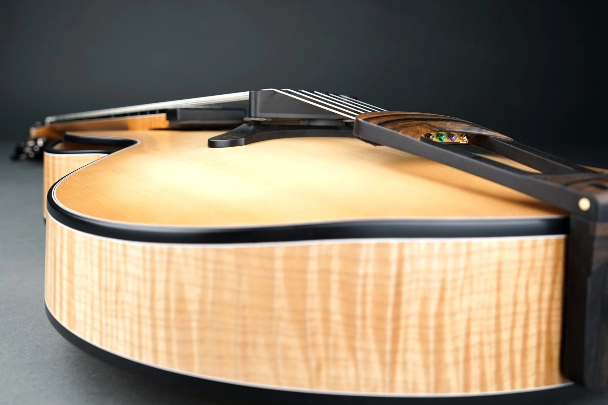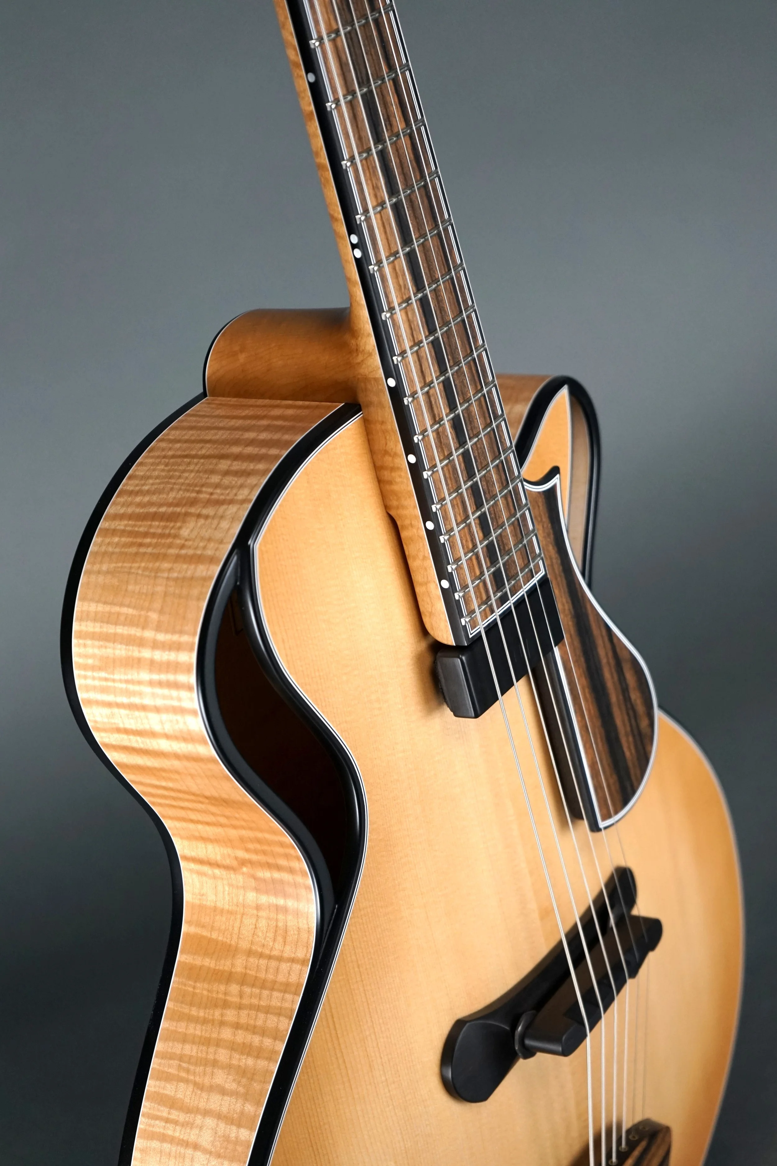 was created with two things in mind. Sweetness of tone and easing the physical limitations of players due to body size, aging, injury, etc… It has a small body with an arm bevel built into the carve of the top and a 3/4 scale… 24” scale length to be specific… the long end of 3/4 scale and the short end of short scale, but the Goldilocks zone for me.